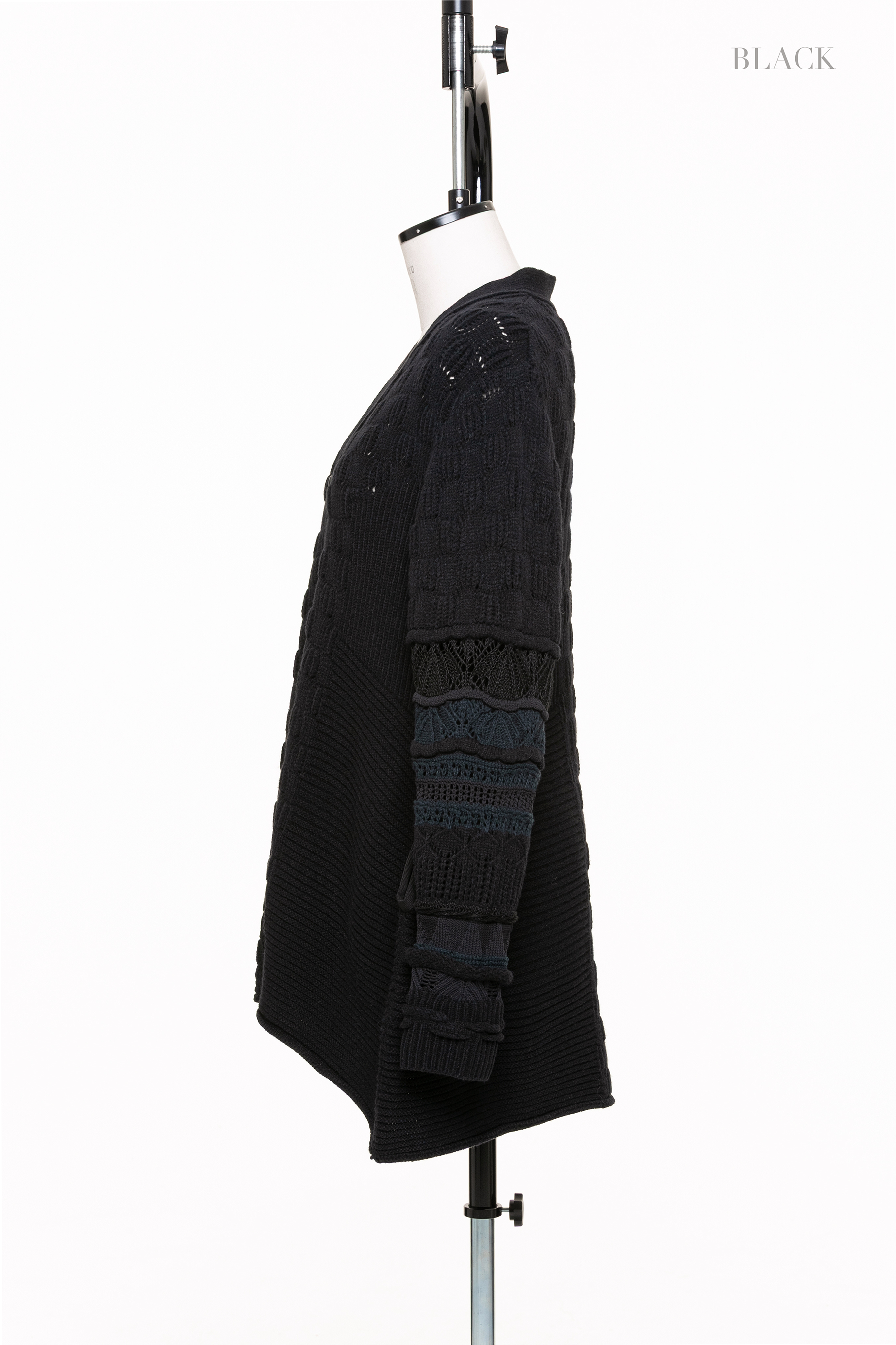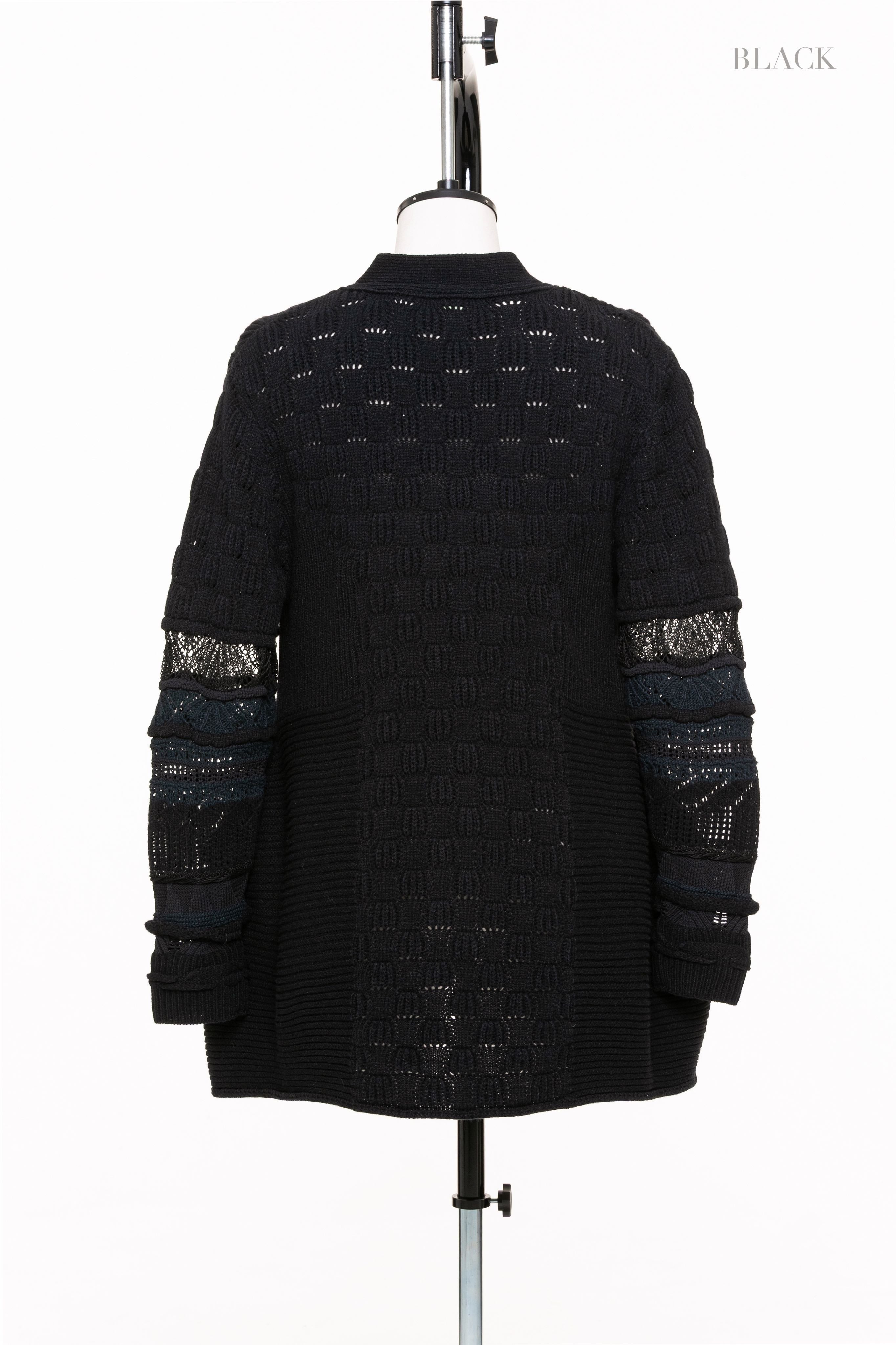 編み組織のリズムが交錯し、地層のように構築された表情が印象的な〈クレイジーニット〉のカーディガン。