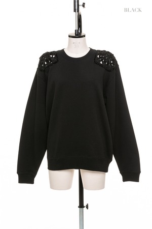 リラックス感のあるスウェットに、両肩へハンドニットのモチーフをあしらった特別な一着。