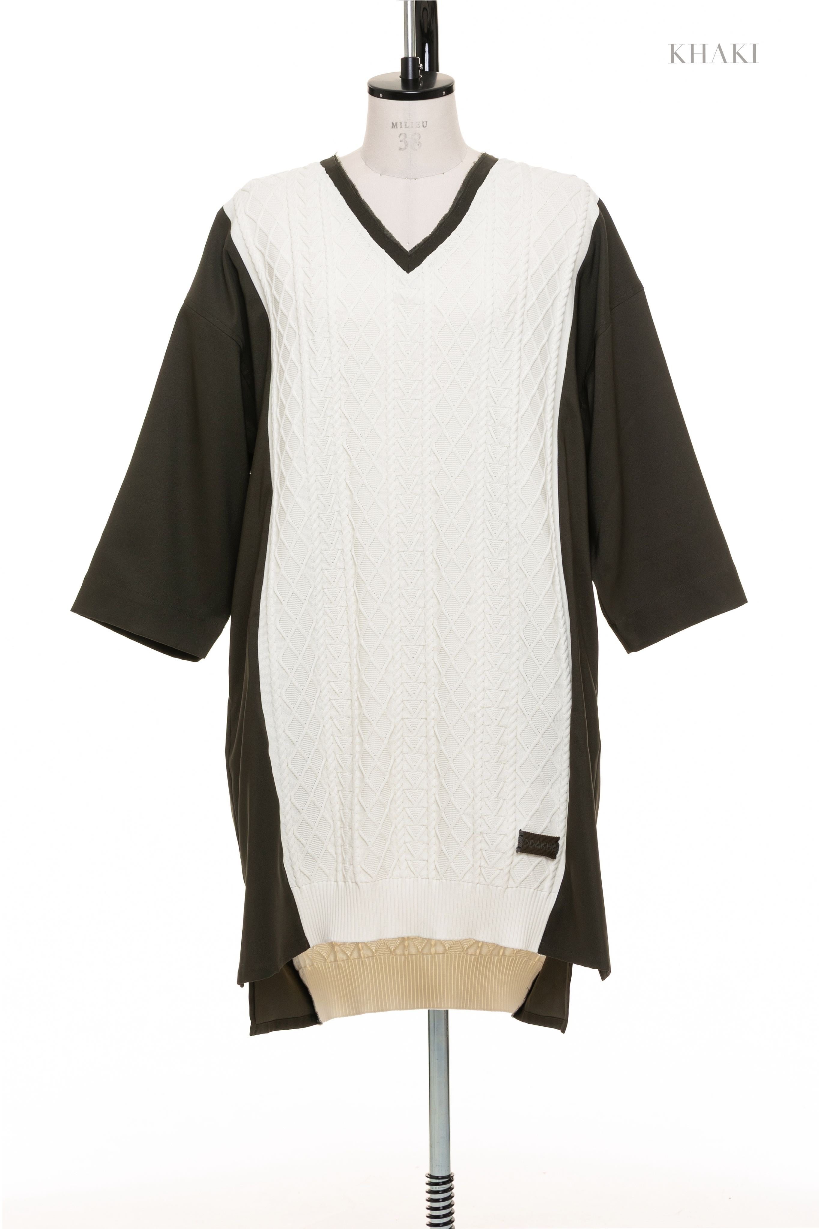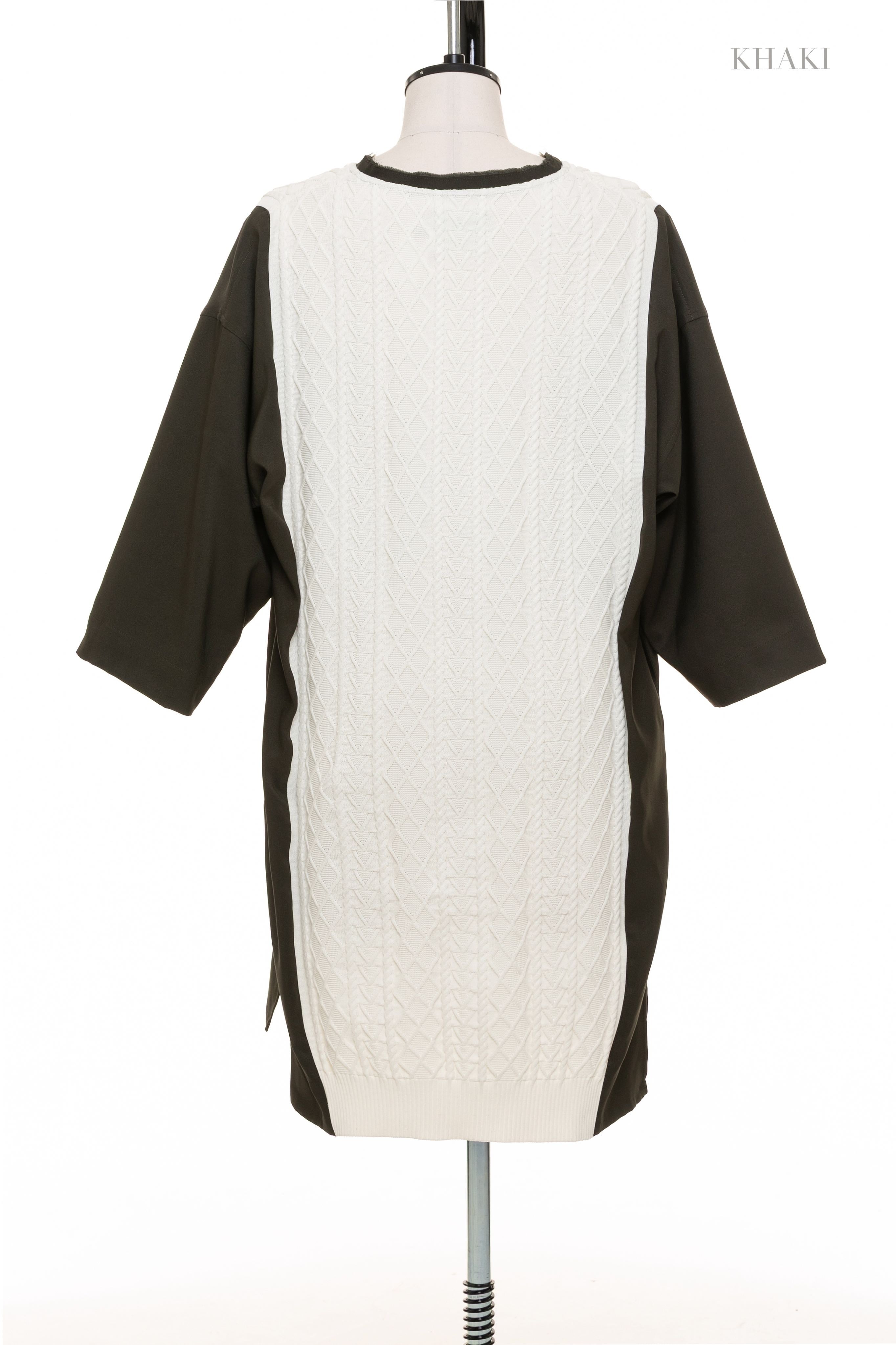 立体感のあるケーブルニットと、しなやかな布帛を組み合わせたショートドレス。