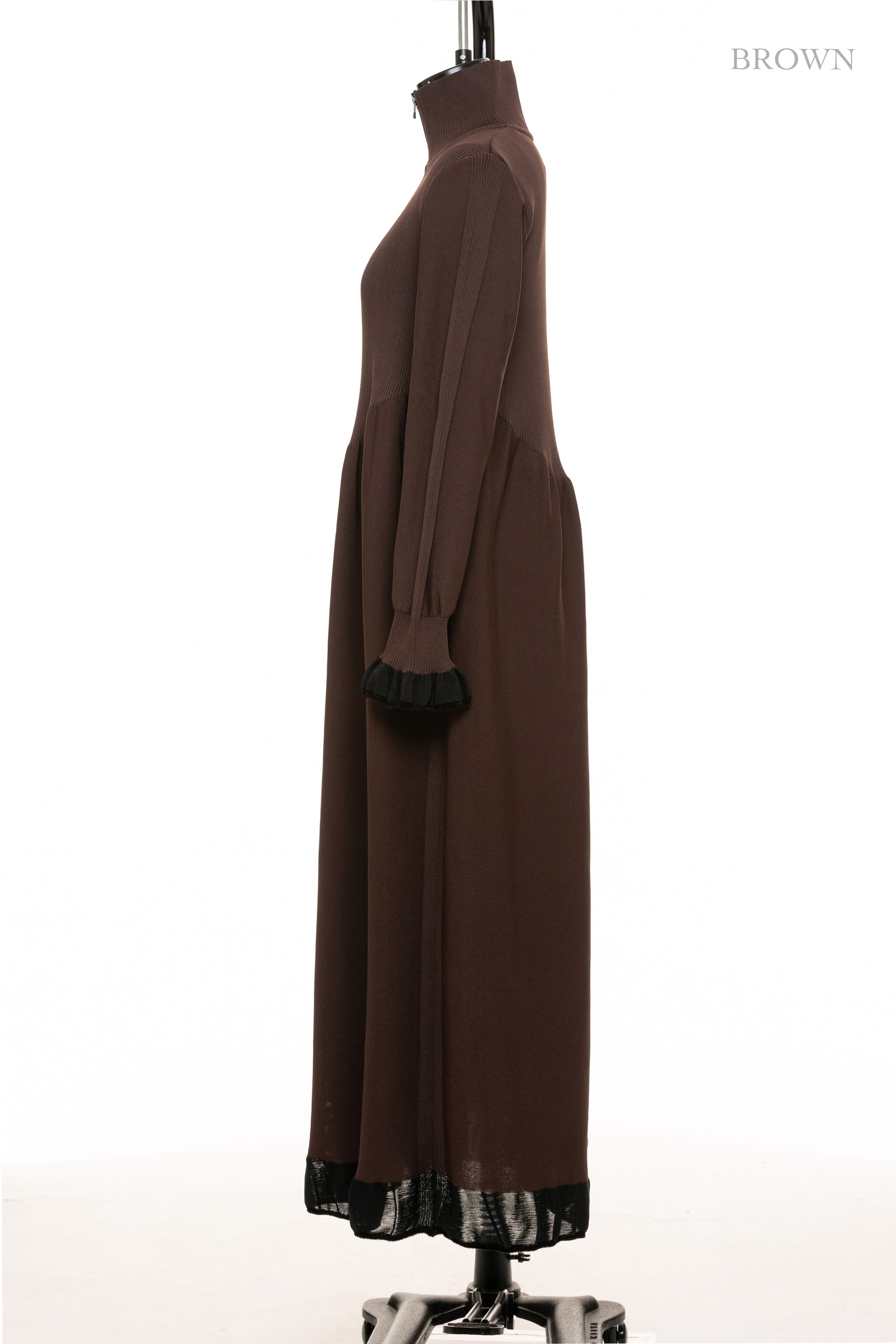 伸縮性に富むドライタッチのポリエステル糸を高密度に編み立てた、軽量タイトフィットのハイゲージドレス。gynoid knit特有の編み組織で生まれる凹凸とフレアを全身に拡張し、ビスチェを想起させる立体的なラインを一枚へと凝縮しました。身体に沿うフィット&フレアシルエットながら透け感はなく、デイリーからオケージョンまで幅広いシーンで活躍。ミニマルな表情の中に構築的なニュアンスを宿した、シリーズの新基軸となるドレスです。