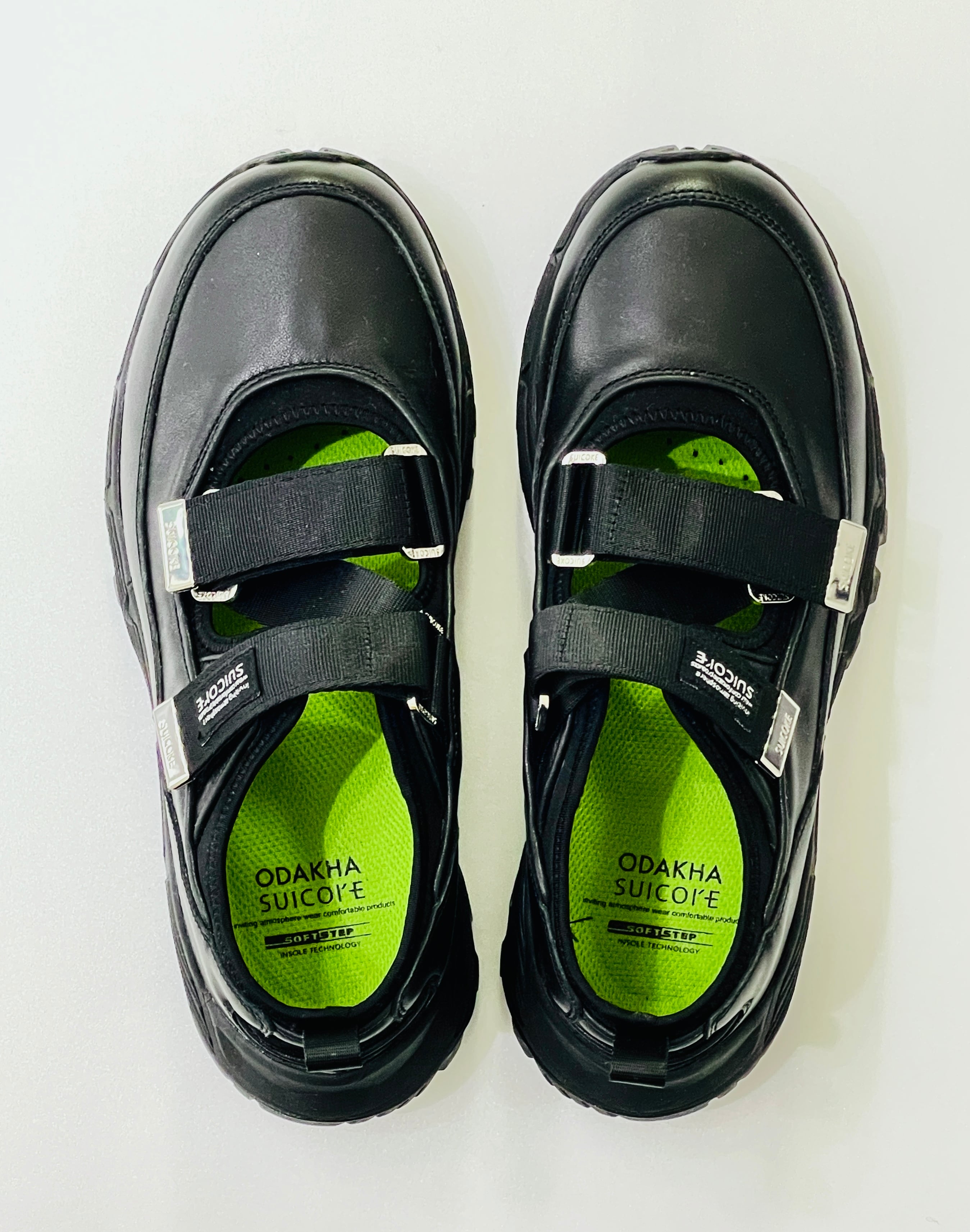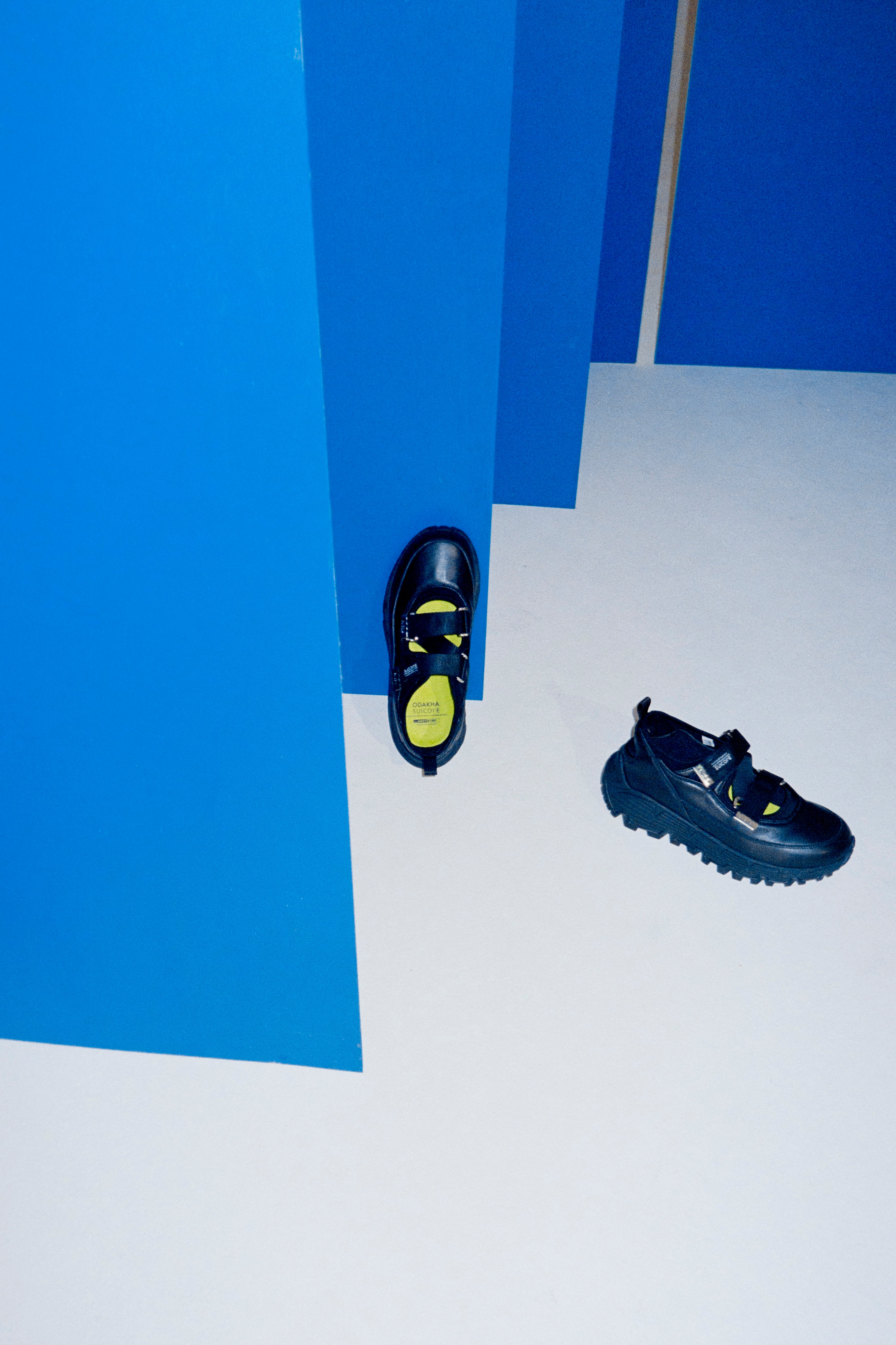 本作は、スニーカーとサンダルを融合させた SUICOKE の⼈気モデル「AKK」をベースに、ODAKHA の視点から再解釈した⼀⾜です。